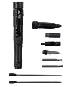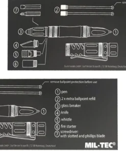 Taktiskā lodīšu pildspalva no mil–TEC, kas aprīkota ar maināmu piederumu komplektu, padarot pildspalvu par daudzfunkcionālu, ārkārtīgi praktisku rīku, noderīgu jebkurā situācijā.Pildspalvas korpuss ir izgatavots no alumīnija, kas nodrošina izturību. Lodīšu pildspalvas galā ir nerūsējošā tērauda ārkārtas stikla lauzējs.